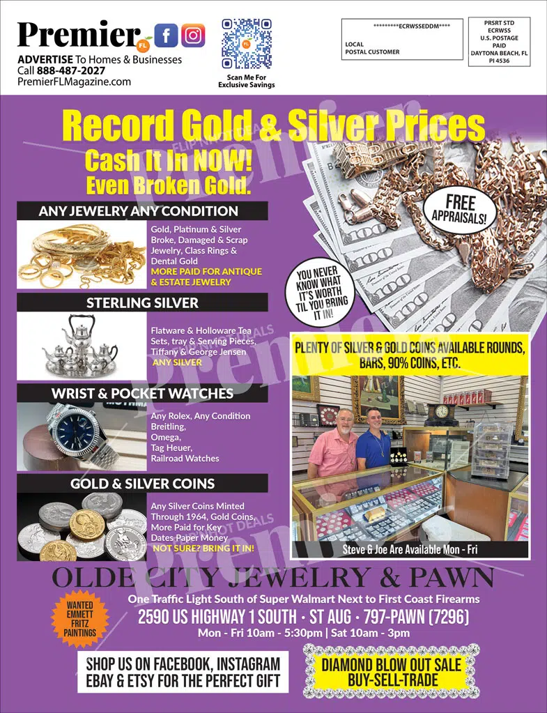 Olde City Jewelry & Pawn is St. Augustineโ€™s trusted destination for buying, selling, and trading fine jewelry, coins, watches, and antiques. Known for honesty and expertise, they provide fair appraisals and top market payouts for gold, silver, and estate pieces โ€” even if theyโ€™re broken or worn.