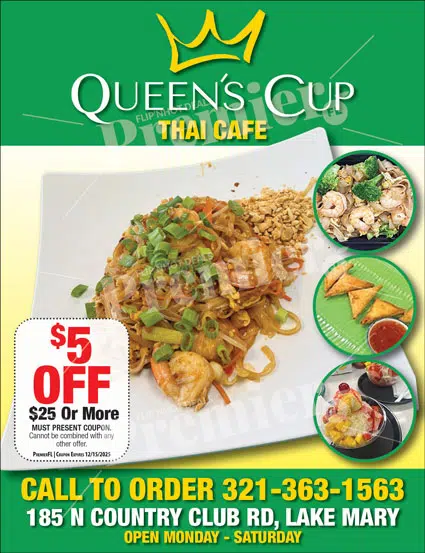 Queenโs Cup Thai Cafรฉ serves up authentic Thai flavors in the heart of Lake Mary. Known for their signature Pad Thai, Green Curry, and Drunken Noodles, each dish is made from fresh ingredients and crafted with care to bring the perfect balance of spice, sweetness, and savory flavor. Whether you dine in or order takeout, youโll enjoy a warm, inviting atmosphere and friendly service that makes you feel right at home.