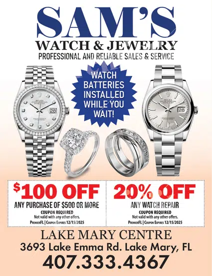 Located at Lake Mary Centre, Samโs Watch & Jewelry is ideal for shoppers seeking professional service, fair pricing, and a local jeweler they can trust. Whether youโre purchasing a gift, upgrading a timepiece, or maintaining your jewelry collection, Samโs delivers quality and peace of mind with every visit.