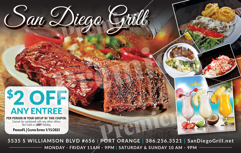Located on South Williamson Boulevard in Port Orange, San Diego Grill offers a welcoming atmosphere with friendly service and a broad menu that fits any occasion. It’s an ideal choice for group dining, family meals, or anyone searching for a casual grill and bar experience with consistent quality.