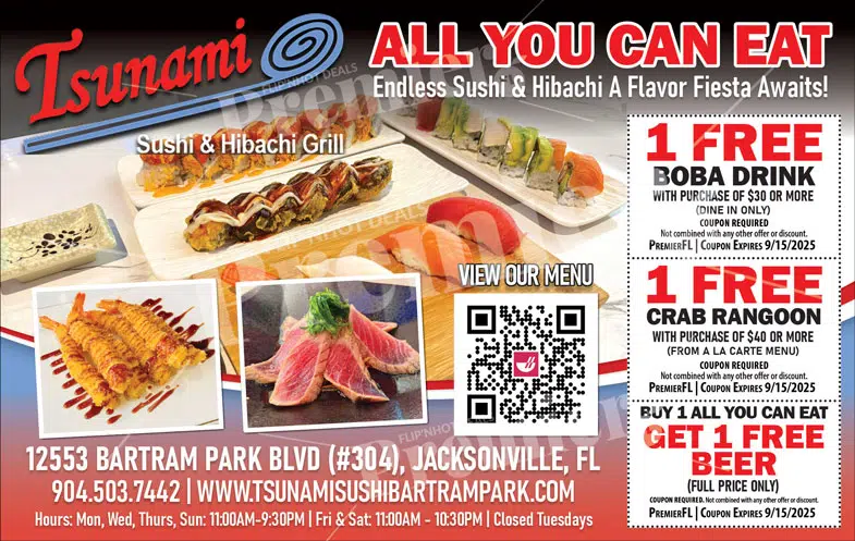 Tsunami Sushi is a traditional Japanese restaurant known for its authentic sushi offerings. Their menu includes a wide variety of sushi rolls, sashimi, and other Japanese dishes, crafted with fresh ingredients for an authentic dining experience.
