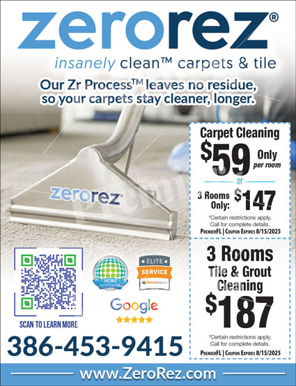 Zerorez delivers revolutionary carpet, tile, and upholstery cleaning using its patented Zr™ Process — leaving no residue behind so your floors stay cleaner, longer. As one of Florida’s highest-rated cleaning services, Zerorez is known for its cutting-edge technology and commitment to customer satisfaction.